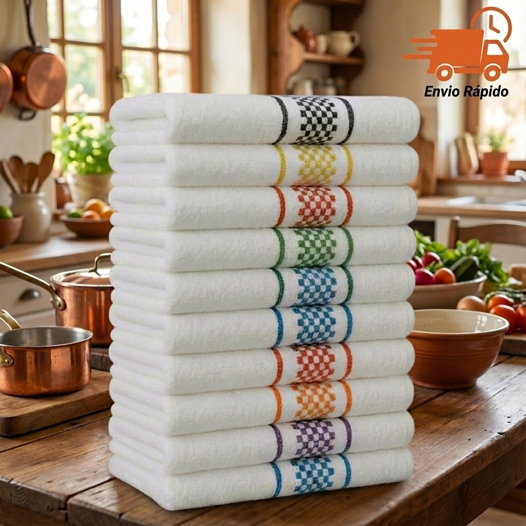 Kit de 10 panos de prato com design xadrez premium jacquard. Cada toalha possui 45cm x 70cm, gramatura de 310g/m² e material 100% algodão. Borda decorativa com cores como verde, azul, vermelho e dourado. Base sempre branca para combinar com qualquer cozinha. Perfeito para pratos, secagem de louças ou decoração.
