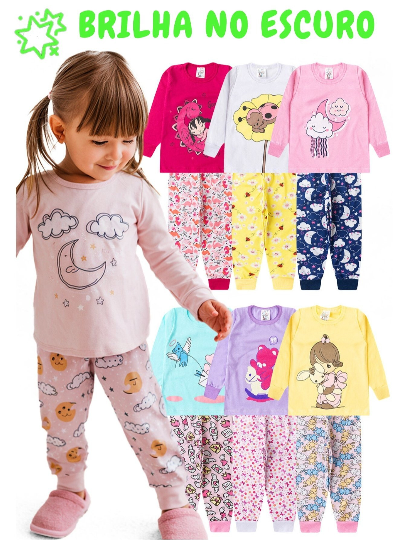 Kit 4 Peças Pijama Sortido Brilha no Escuro Infantil Menina Inverno Roupa Infantil Feminina