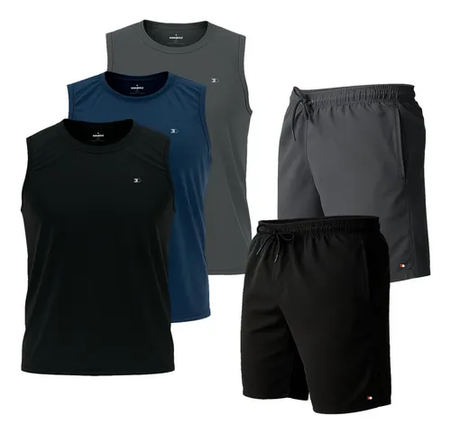 Inclui 3 camisas regata Dry-Fit e 2 shorts tactel, ideais para atividades físicas ou momentos de lazer.